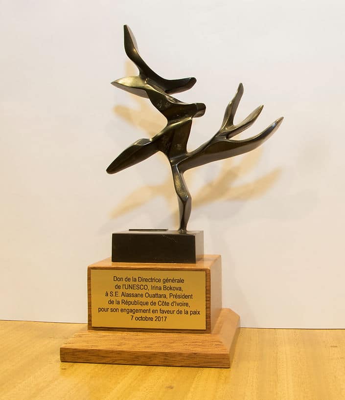 Le Président de la République de la Côte d’Ivoire, Monsieur Alassane Ouattara, reçoit le trophée de l’Arbre de la Paix par Madame Irina Bokova, Directrice Générale de l’UNESCO le 7 octobre 2017.